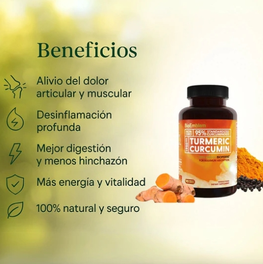 El Curcumin BioEmblem es el suplemento natural más completo para fortalecer tu salud, reducir inflamaciones y mejorar tu energía diaria. Su fórmula importada de EE.UU. combina cúrcuma orgánica con bioperina (extracto de pimienta negra) para garantizar una absorción hasta 20 veces más efectiva que otras marcas.